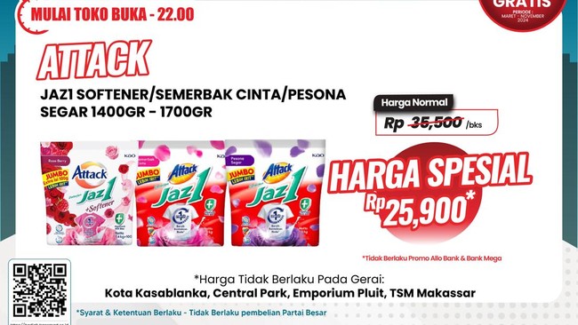 Salah satu produk yang dapat diskon adalah detergen. Attack Jaz1 1400-1700 gr ditawarkan harga spesial 25.900/kantong dari harga normal Rp 35.500/kantong. Harga diskon tersebut berlaku untuk varian Semerbak Cinta, Pesona Segar, Softener.