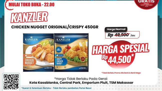 Salah satu produk yang diobral jadi murah meriah ialah chicken nugget merek Kanzler. Harga nugget dengan kemasan 450 gram itu dibanderol cuma Rp 44.500 dari awalnya Rp 49.900 per bungkus.