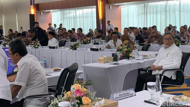 Menteri KP Sakti Wahyu Trenggono dan Menteri Koordinator Bidang Pangan Zulkifli Hasan (Zulhas) masuk bersamaan ke ruang rapat sekitar pukul 10.00 WIB. Hadir juga Wakil Menteri Dalam Negeri Bima Arya.