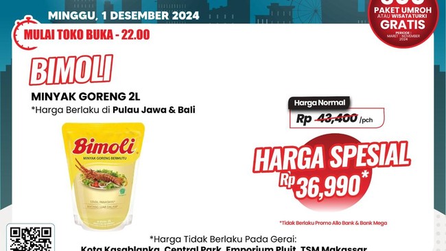 Minyak goreng Bimoli 2 liter ditawarkan dengan harga spesial Rp 38.990 dari harga normal Rp 43.400 berlaku di Jawa dan Bali. Harga tersebut tidak berlaku pada gerai Kota Kasablanka, Central Park, Emporium Pluit dan TSM Makassar.
