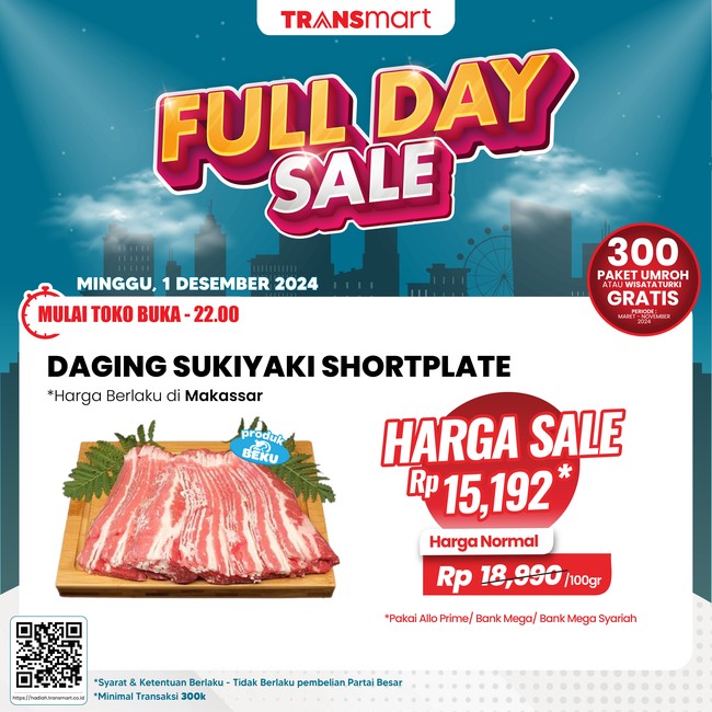 Di Transmart Full Day Sale Jabodetabek, daging shabu slice 500 gram diobral dari harga normal Rp 102.000 menjadi Rp 127.500. Diskon ini bisa didapatkan jika transaksi menggunakan Allo Prime, kartu kredit Bank Mega atau Bank Mega Syariah.
