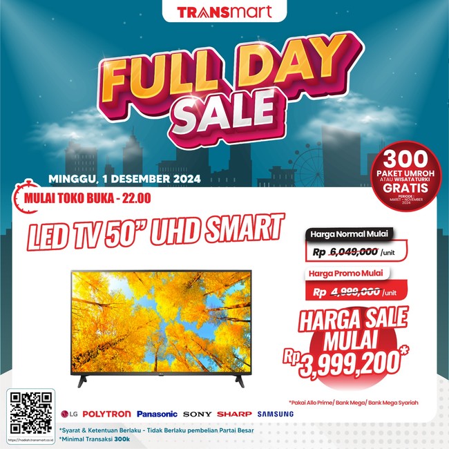 Transmart Full Day Sale menawarkan produk LED TV 50" UHD Smart dengan harga promo mulai Rp 4.999.000/unit. Harga itu sudah potongan dari harga normal mulai Rp 6.049.000/unit.
