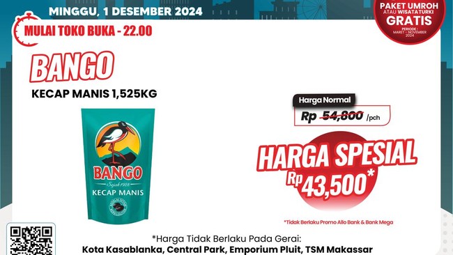 Khusus hari ini Minggu (1/12/2024), selama seharian penuh, akan ada beragam diskon gila-gilaan yang ditawarkan Transmart Full Day Sale. Salah satunya, adalah diskon untuk produk Bango Kecap Manis 1,525 kg.