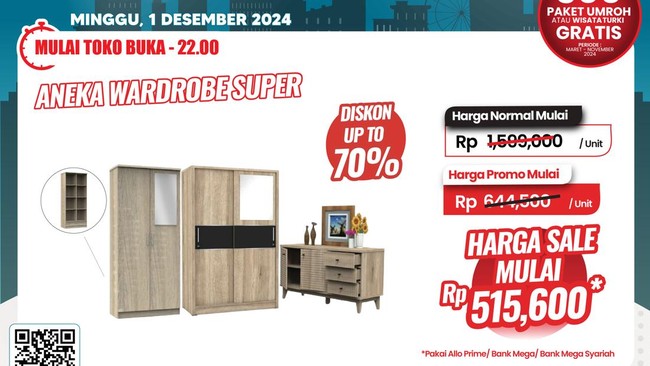 Nah salah satu furnitur yang ditawarkan dengan diskon besar-besaran adalah wardrobe atau lemari baju. Lemari ini ditawarkan dengan harga promo mulai dari Rp 644.500 per unit dari harga normalnya Rp 1.599.000.