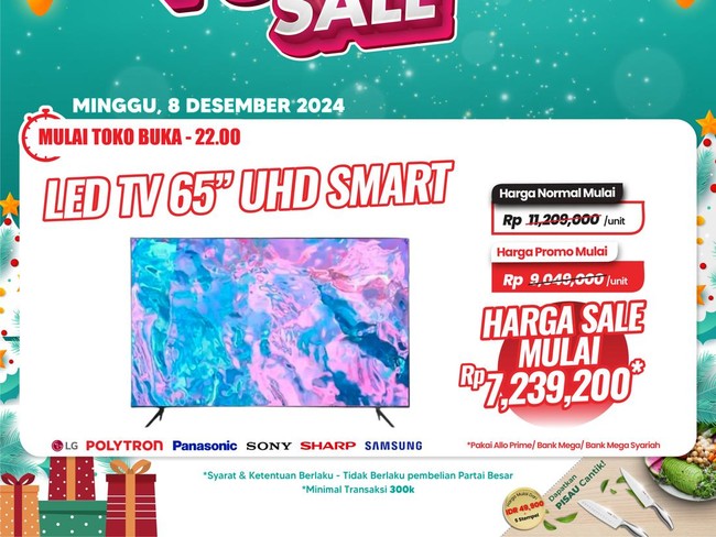 Jika pembayaran menggunakan Allo Prime, kartu kredit Bank Mega atau Bank Mega Syariah, bisa dapat potongan harga lagi 20% menjadi hanya Rp 7.239.200/unit. Artinya pembeli bisa hemat hingga Rp 3.969.800 dari harga normal saat membeli LED TV 65" UHD Smart.