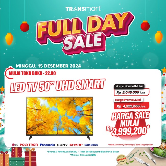 Transmart kembali menggelar promo Full Day Sale pada Minggu 15 Desember 2024. Pada Transmart Full Day Sale ada diskon hingga 50+20% mulai dari toko di buka sampai pukul 22.00.