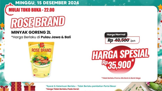 Merek lainnya seperti Rose Brand juga diskon besar. Minyak Rose Brand 2 liter ditawarkan dengan harga spesial Rp 35.900 dari harga normalnya Rp 40.500.