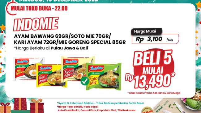 Khusus hari ini, pelanggan bisa mendapat harga spesial setiap pembelian 5 bungkus Indomie varian mi goreng spesial, ayam bawang, soto mie, kari ayam seharga Rp 13.490.