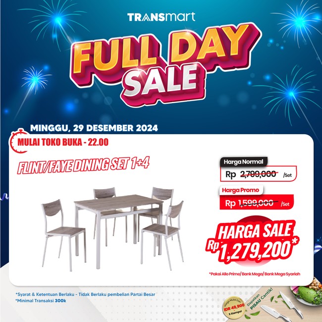 Spesial di akhir pekan ini, ada diskon untuk produk Flint/Faye Dining Set 1+4. Khusus di Transmart Full Day Sale, produk ini ditawarkan dengan harga promo Rp 1.599.000 dari harga normalnya Rp 2.799.000.