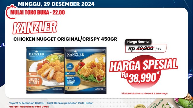 Khusus hari ini, pelanggan bisa mendapat harga spesial untuk pembelian chicken nugget merek Kanzler. Harga nugget dengan kemasan 450 gram itu ditawarkan dengan harga Rp 38.990 dari harga normal Rp 49.900 per bungkus. Harga di atas tidak berlaku di gerai Transmart Kota Kasablanka, Central Park, Emporium Pluit, TSM Makassar.