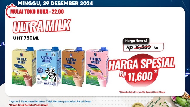 Susu UHT merek Ultra Milk 750 ml dengan varian rasa coklat, full cream, moka, dan strawberry dijual dengan harga spesial Rp 11.600/kotak dari harga awalnya Rp 16.500 per kotak.