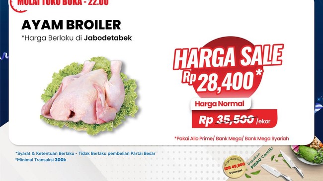 Daging ayam broiler didiskon dari harga Rp 35.500/ekor menjadi Rp 28.400/ekor. Harga diskon ini berlaku di Jabodetabek.