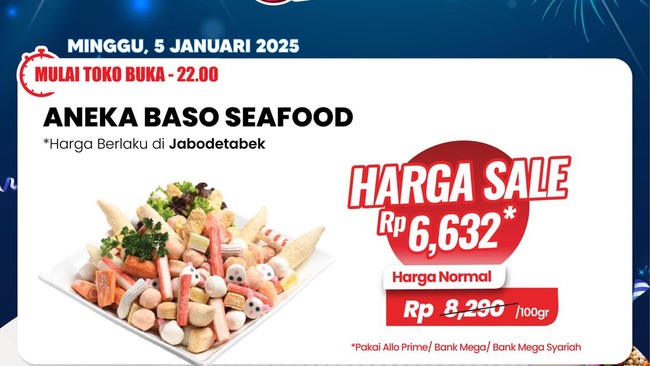 Di Transmart Full Day Sale Denpasar, harga aneka baso seafood didiskon menjadi Rp 7.920 per 100 gram dari harga normal Rp 9.900 per 100 gram. Diskon ini bisa didapatkan jika transaksi menggunakan Allo Prime, kartu kredit Bank Mega atau Bank Mega Syariah.