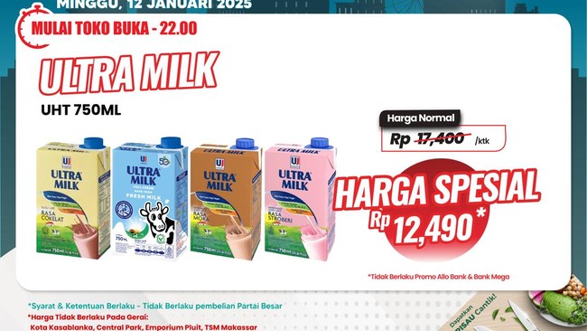 Susu UHT merek Ultra Milk 750 ml dengan varian rasa coklat, full cream, moka, dan strawberry dijual dengan harga spesial Rp 12.490/kotak dari harga awalnya Rp 17.400 per kotak.