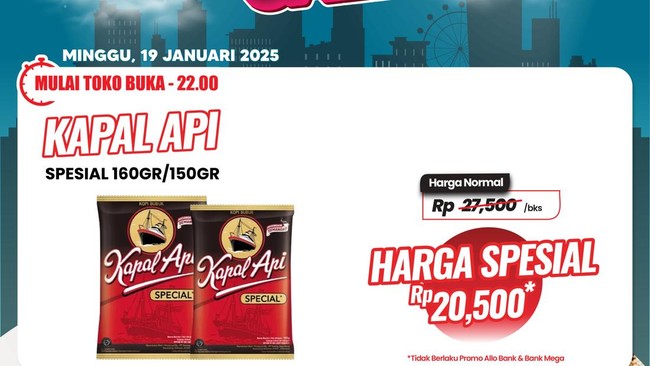 Aneka produk dijual dengan harga diskon, termasuk kategori FMCG (Fast Moving Consumer Goods). Salah satunya kopi Kapal Api Special 160 gram/150 gram yang dijual dengan harga promo Rp 20.500 dari harga normal Rp 27.500 per bungkusnya. Dengan kata lain, ada diskon Rp 7.000