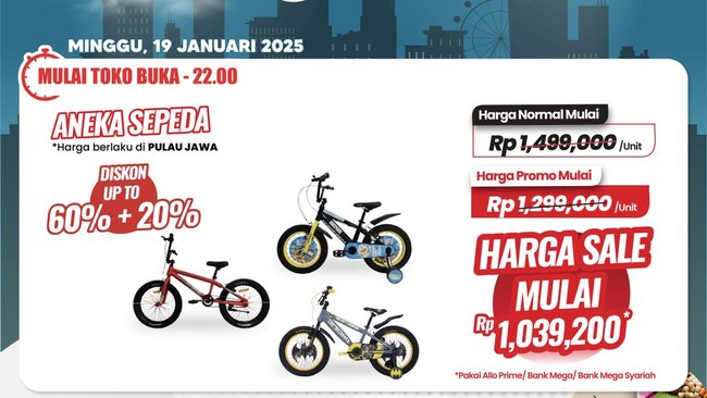 Speda bakal jadi lebih murah dengan tambahan diskon 20% kalau transaksi pakai Allo Prime, Allo Paylater, kartu kredit Bank Mega, atau Bank Mega Syariah. Produk sepeda harganya jadi mulai dari Rp 1.039.200. Pembeli bisa menikmati diskon Rp 459.800 dari harga normal.