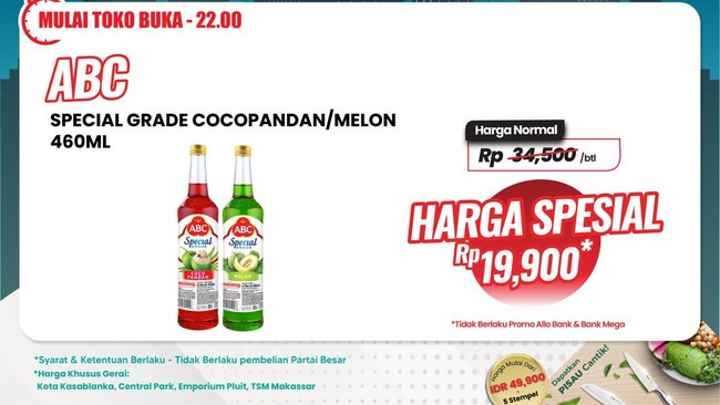 Kemudian ada sirup ABC Special Grade rasa cocopandan dan melon 460 ml cuma Rp 19.900/botol dari harga normal Rp 34.500/botol.