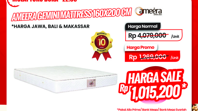 Produk Ameera Gemini Mattress 160x200 cm dibanderol dengan harga promo mulai Rp 1.269.000 per unit dari harga normal mulai Rp 3.900.000 per unit. Tenang saja, harga bisa turun lagi jika anda menggunakan kartu kredit Bank Mega atau Bank Mega Syariah, Allo Prime menjadi Rp 1.015.200 per unit. Harga ini hanya berlaku di Jawa, Bali dan Makassar. Untuk harga di luar lokasi itu jadi Rp 1.228.000 per unit.