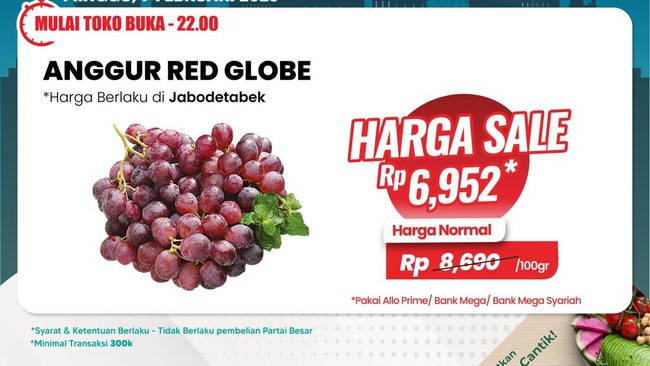 Tidak cuma anggur red globe, ada pula anggur muscat yang juga diskon di Lampung jadi seharga Rp 6.840 per 100 gram dari sebelumnya Rp 8.550 per 100 gram. Lalu, ada pula promo Pear Khung Lie di Makassar jadi seharga Rp 2.472 per 100 gram dari harga normal Rp 3.090 per 100 gram. Perlu dicatat bahwa syarat dan ketentuan berlaku untuk menikmati diskon ini. Kemudian, promo ini tidak berlaku untuk pembelian partai besar, dan minimal transaksinya Rp 300.000.