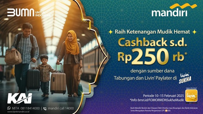 Kabar gembira buat kamu yang merencanakan perjalanan mudik Lebaran tahun ini dengan naik kereta api! Bank Mandiri menghadirkan program spesial bertajuk Livin' Sukha Mudik yang menawarkan promo cashback tiket Kereta Api Indonesia (KAI) melalui fitur Sukha di aplikasi Livin' by Mandiri.