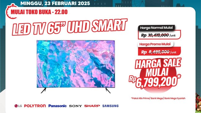 Beragam promo dihadirkan untuk pembelian produk sehari-hari hingga barang elektronik. Salah satu produk yang dapat diskon jumbo adalah TV LED 65" UHD Smart TV dari berbagai merek. Harga normal TV tersebut mulai dari Rp 10.419.000. Khusus di Transmart Full Day Sale, produk tersebut promo menjadi mulai dari Rp 8.499.000.