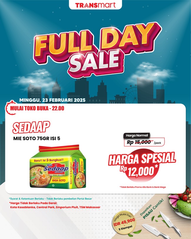 Ayo! Segera merapat ke Transmart terdekat dan nikmati diskon di Transmart Full Day Sale.