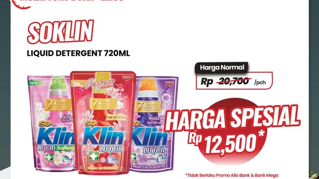 Soklin Liquid Detergent 720 ml ditawarkan dengan harga spesial Rp 12.500 dari harga normal Rp 20.700 per bungkus.