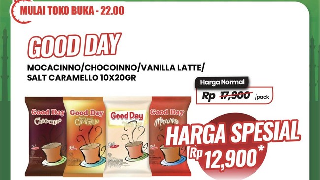 Kemudian, kopi Good Day varian Mocacinno, Chococinno, Vanilla Latte, Salt Caramelo 10x20 gram harga normalnya Rp 17.900 per bungkus. Setelah didiskon harganya menjadi Rp 12.900 per bungkus.