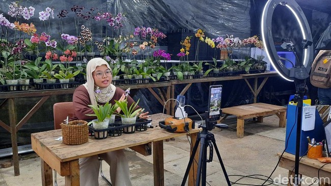 Ketika detikcom berkunjung ke tokonya pada Jumat (28/2) lalu, waktu masih menunjukkan pukul 10.00 WIB. Belum ada aktivitas live selling. Namun, terlihat puluhan pot anggrek bulan sedang ditempeli resi untuk pengiriman.