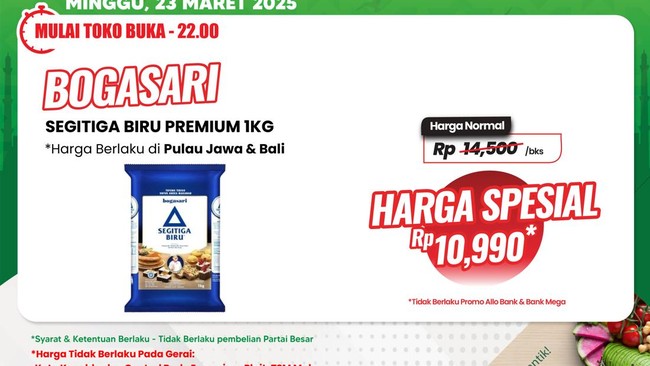 Khusus hari ini, pelanggan bisa mendapat harga spesial tepung terigu keluaran Bogasari 1 kg Rp 10.990/bungkus. Padahal harga awal Rp 14.500 per bungkus. Perlu diingat, harga ini hanya berlaku di Pulau Jawa dan Bali.
