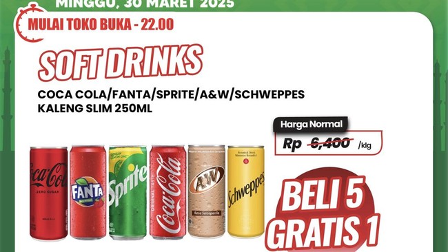 Tidak hanya kemasan botol yang dapat potongan harga, Coca cola, Sprite, Fanta, A&W, dan Schweppes kemasan kaleng 250 ml juga dapat penawaran menarik yakni beli 5 gratis 1 kaleng.