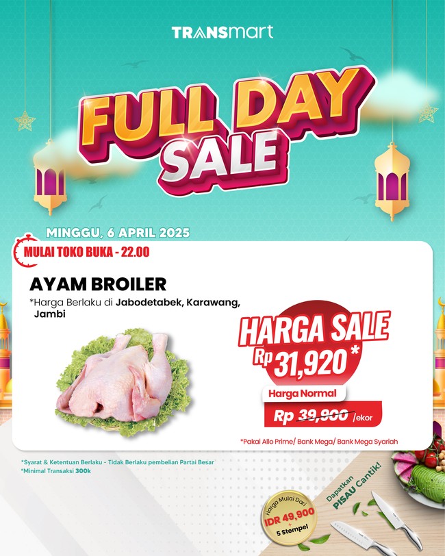 Di Transmart Full Day Sale Jabodetabek, Karawang, dan Jambi ini ayam broiler diobral cuma Rp 31.920/ekor dari harga normal Rp 39.900/ekor. Harga itu bisa didapatkan jika melakukan pembayaran menggunakan Allo Prime, kartu kredit Bank Mega atau Bank Mega Syariah.