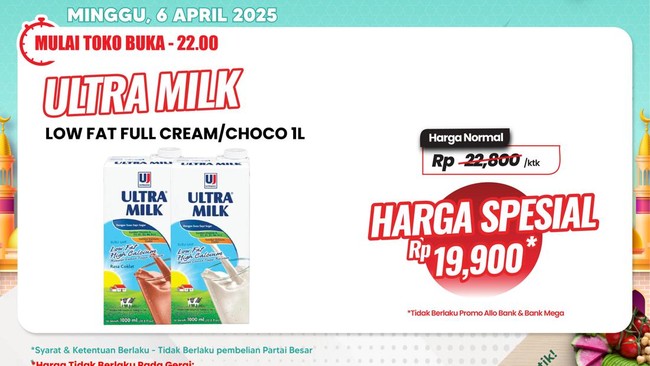 Susu UHT merek Ultra Milk 1 Liter dengan varian rasa coklat, full cream dibanderol dengan harga spesial Rp 15.900/kotak dari harga awalnya Rp 21.200 per kotak. Selain itu, ada juga Ultra Milk Low Fat 1 L varian Full cream dan Choco ditawarkan dengan harga spesial Rp 19.900/kotak dari harga sebelumnya Rp 22.800/kotak.