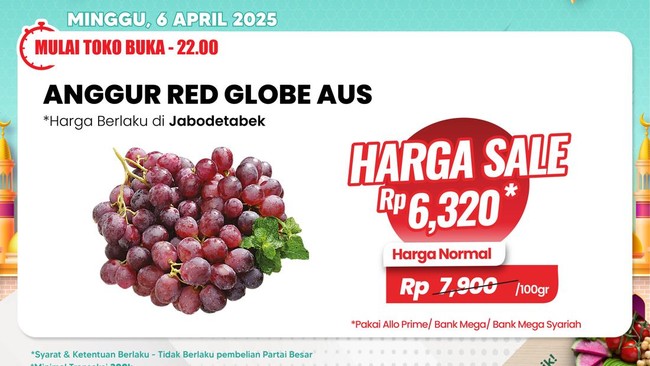 Di Transmart daerah Jabodetabek, anggur red globe didiskon menjadi Rp 6.320 per 100 gram dari harga normalnya Rp 7.900 per 100 gram. Di daerah lain pun, produk ini juga diskon. Seperti di Jawa Barat harganya dibanderol jadi Rp 6.560/100 gr dari harga normal Rp 8.200/100 gr. Kemudian di Jawa Timur produk ini dibanderol jadi Rp 4.792 per 100 gram dari harga normal Rp 5.990 per 100 gram.