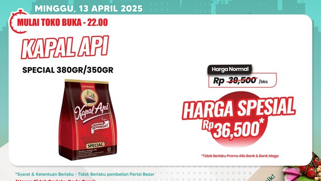 Salah satu produk dijual dengan harga spesial hari ini ialah produk kopi merek Kapal Api spesial 380 gram/350 gram dibanderol dengan harga Rp 36.500 dari harga normal RP 39.500.