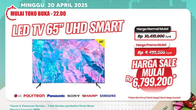 Sementara jika pelanggan mencari ukuran yang lebih besar, ada LED TV 65" UHD Smart dengan harga promo mulai Rp 8.499.000/unit. Harga itu sudah potongan dari normalnya mulai Rp 10.419.000/unit.