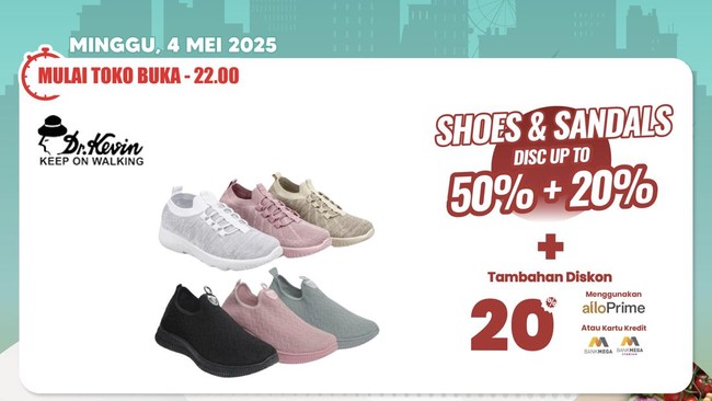 Salah satu sepatu dan sandal aneka sneakers dr. Kevin dapat diskon 50%+20%. Harga dan diskon di atas masih dapat tambahan diskon lagi dengan cukup membayar dengan Allo Prime, Kartu Kredit Bank Mega atau Bank Mega ada tambahan diskon 20%.