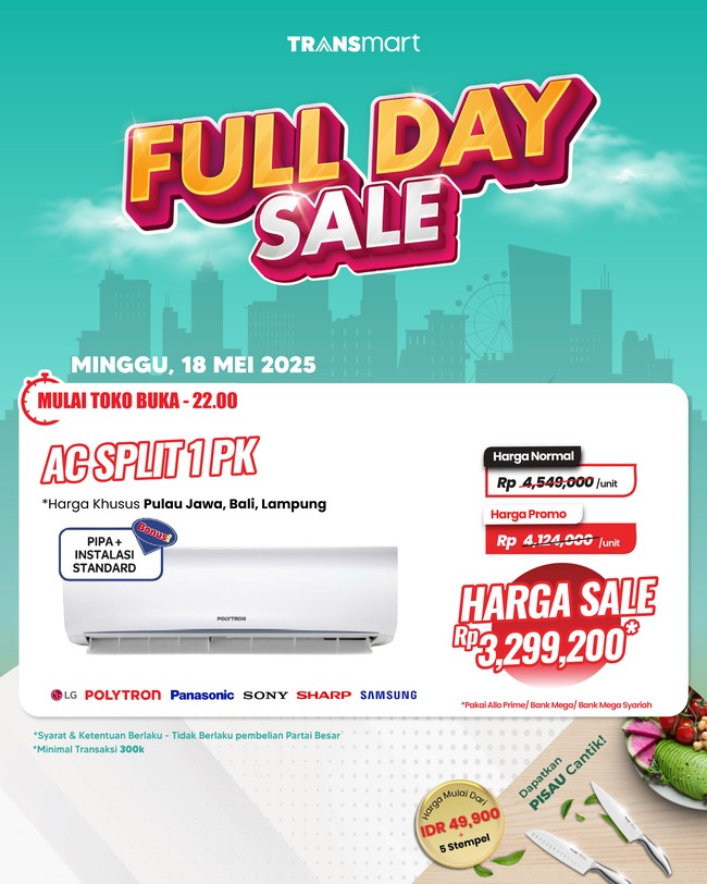 Gebyar diskon ini berlangsung sejak toko buka hingga tutup pukul 22.00 waktu setempat di seluruh gerai Transmart se-Indonesia. Selama seharian penuh, produk AC Split 1 PK berbagai merek dibanderol dengan harga miring.