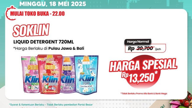 Salah satu produk yang mendapatkan harga spesial adalah adalah detergen. Soklin Liquid Detergent 720 ml ditawarkan dengan harga spesial Rp 13.250/bungkus dari harga sebelumnya Rp 20.700/bungkus. Perlu diingat, harga diskon tersebut hanya berlaku di Pulau Jawa dan Bali.