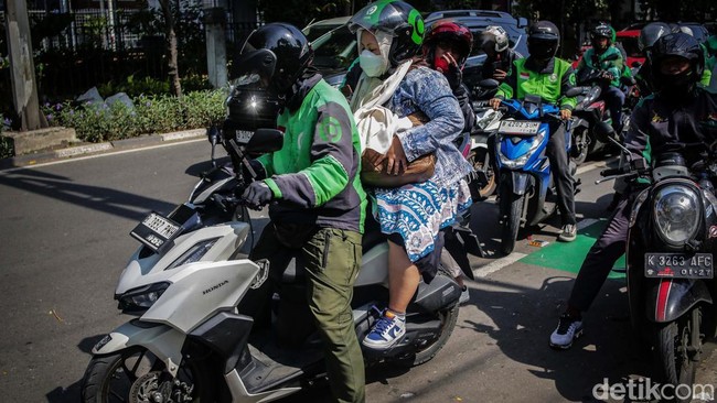Namun dalam kesempatan ini, driver yang tiba tidak mengenakan atribut helm atau jaket Gojek. Hanya helm penumpang yang masih menggunakan atribut dari aplikasi transportasi online tersebut.