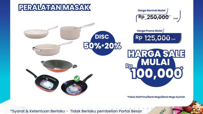 Kemudian juga ada peralatan makan harga jualnya mulai Rp 12.000/unit jika pembayaran menggunakan Allo Prime, kartu kredit Bank Mega atau Bank Mega Syariah, dari harga normalnya Rp 59.000/unit.