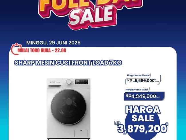 Diskon yang ditawarkan tak main-main hingga 50% + 20% dan berlaku untuk berbagai produk. Salah satunya adalah Sharp Mesin Cuci Front Load 7 Kg yang mendapatkan potongan harga lebih dari Rp 1 jutaan.