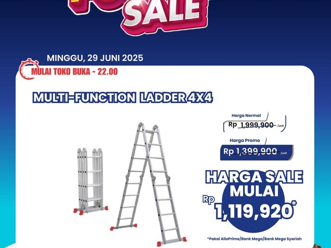 Diskon yang ditawarkan hingga 50% + 20%. Salah satunya adalah produk tangga multifungsi. Khusus selama gelaran Transmart Full Day Sale, produk multifunction ladder 4x4 atau tangga multifungsi berlaku harga promo menjadi Rp 1.399.900/unit. Padahal harga normalnya Rp 1.999.900/unit.