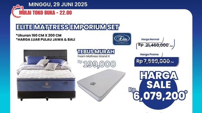Spesial hari ini, beli tempat tidur Elite Mattress Emporium Set dapat tebus murah kasur Mattress Grand X seharga Rp 199.000. Di Pulau Jawa, produk tersebut dibanderol dengan harga promo Rp 7.599.000 dari harga awal Rp 21.460.000.