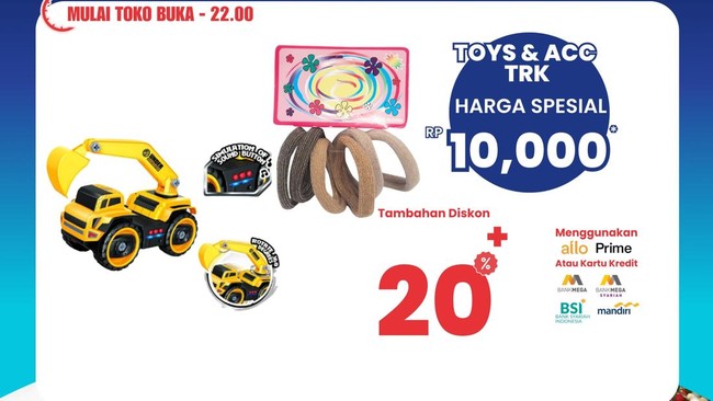 Mainan mobil truk keluaran Toys & AC dibanderol dengan harga spesial Rp 10.000. Ada tambahan diskon 20% jika menggunakan Allo Prime dan kartu kredit Bank Mega atau Bank Mega Syariah.
