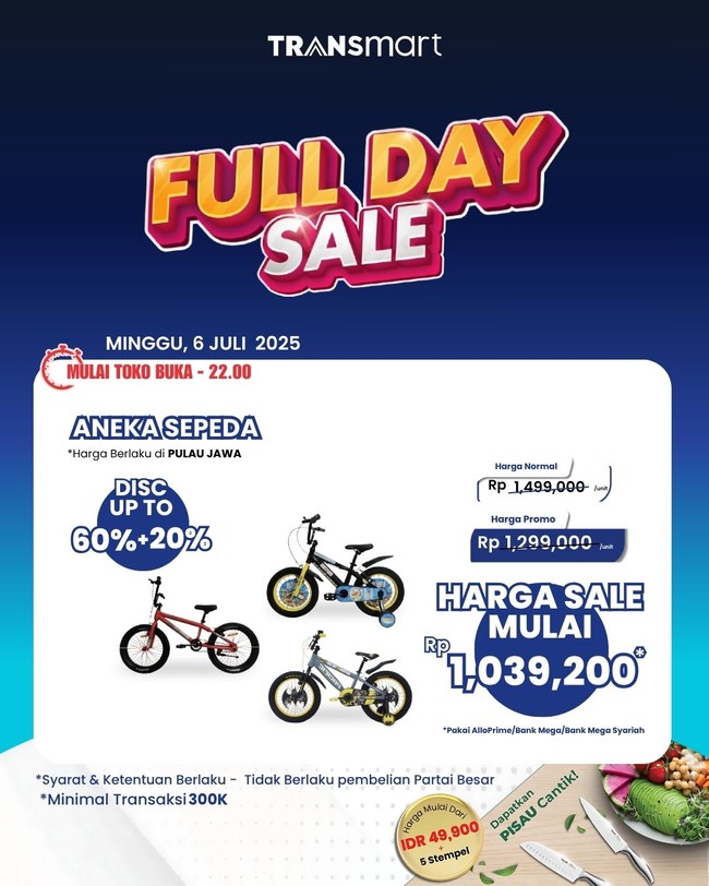 Produk sepeda menjadi salah satu yang mendapat diskon mentereng. Ada diskon spesial untuk aneka sepeda di Transmart Full Day Sale, dengan diskon hingga 60% + 20%.