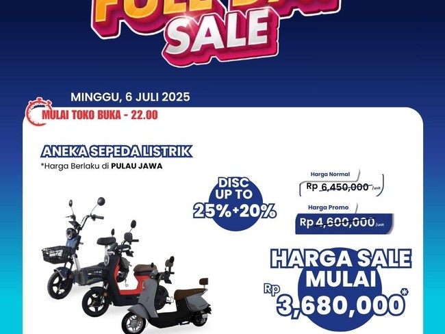 Khusus luar Jawa, sepeda listrik ditawarkan dengan harga promo Rp 4.900.000 dari harga normal Rp 6.750.000. Kemudian, sepeda tersebut ditawarkan dengan harga sale mulai dari Rp 3.920.000.