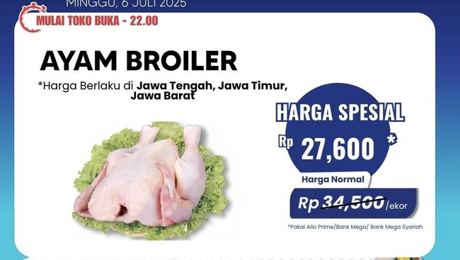 Kemudian untuk wilayah Lampung dan Pangkal Pinang, harga ayam broiler dikenakan hanya Rp 28.720 per ekor, dari harga normalnya Rp 35.900 per ekor. Lalu untuk wilayah Makassar dikenakan harga spesial Rp 28.900 per ekor. Untuk wilayah Makassar tidak berlaku diskon pembelian bagi pembayaran menggunakan Allo Bank/Bank Mega.