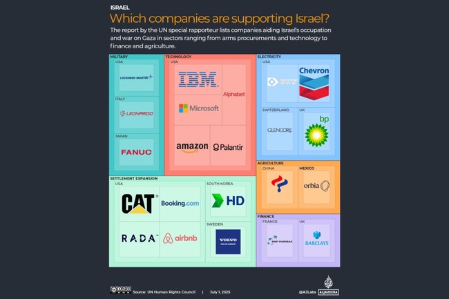 Albanese menyebutkan bahwa ada 48 perusahaan mulai dari teknologi, militer, konstruksi sipil, energi, finansial hingga agrikultur yang terlibat dalam genosida tersebut. Perusahaan-perusahaan itu terlibat dan memiliki peran masing-masing dalam penjajahan Israel di Tepi Barat dan Gaza.