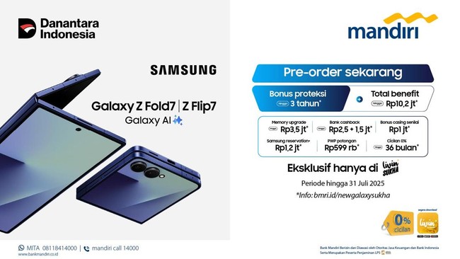 Dapatkan cashback ekstra hingga Rp599 ribu buat kamu yang membeli Samsung Galaxy Z Fold7 atau Z Flip7 bersama Galaxy Watch8 atau Watch8 Classic melalui menu Samsung Exclusive Store di Livin' Sukha. Benefit ini berlaku untuk pembayaran menggunakan Mandiri Tabungan atau Mandiri Kartu Kredit.